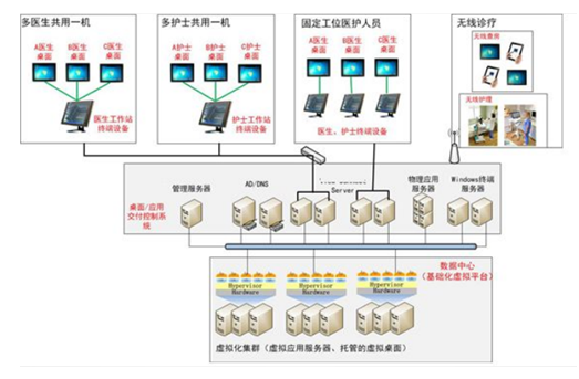 在医院部署华云安全云桌面设备,在医护人员等工作人员的电脑终端安装云桌面客户端。通过标准化的管理,个性化的配置,和虚拟化技术的引入,大大减轻了医院IT维护人员的工作负担,同时也确保了数据的安全。医护人员可以通过医院任何区域的客户端,或以远程的方式来访问应用程序和病人的病历,提高医疗服务质量和速度。