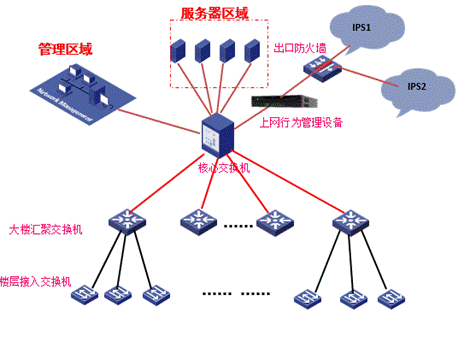 在企业核心交换机和防火墙之间布置上网行为管理设备,对员工的上网行为进行管控。